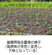 基腐病発生圃場に導入可能基腐病にやや強い抵抗性を有するため、基腐病が発生した圃場であっても、「こないしん」の導入により、基腐病による被害を低減させることができる。 でん粉原料の安定供給に寄与基腐病、つる割病、センチュウに強いため、でん粉原料用カンショの安定生産が期待できる。 |