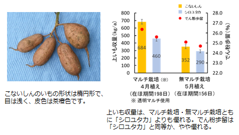 農家数の減少、サツマイモ基腐病(以下、基腐病)やつる割病等の被害の拡大により、現在のでん粉原料用カンショ品種の生産量は減少し、でん粉工場では深刻な原料不足に悩まされている。 でん粉原料用カンショ「こないしん」は、現在の主力品種「シロユタカ」よりも、いもの収量およびでん粉収量が2割~5割ほど優れている。また、病虫害抵抗性にも優れ、「シロユタカ」よりも基腐病とつる割病に強く、サツマイモネコブセンチュウに強、ミナミネグサレセンチュウにやや強の抵抗性を示す。 ![]() |