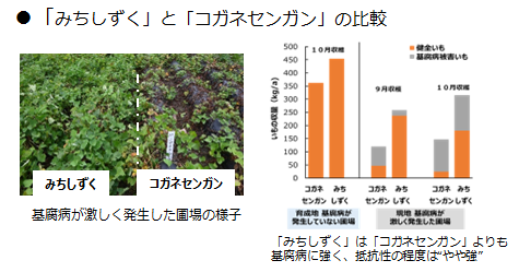 基腐病発生圃場に導入可能基腐病にやや強い抵抗性を有するため、基腐病が発生した圃場であっても、「みちしずく」の導入と基腐病の基本対策(健全種苗の生産、排水対策、残渣処理など)の実施により、基腐病による被害を低減させることができる。 焼酎・でん粉原料の安定供給に寄与基腐病、線虫、立枯病に強く、多収であるため、防除対策のための農薬使用量の削減や原料いもの安定供給が期待できる。 |