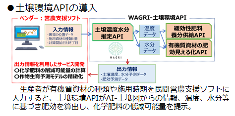 圃場一筆ごとに肥料や有機質資材から供給される養分量を可視化するため、既存土壌図の問題点(低解像度、空白域など)を解消し、一筆ごとの土壌特性を確認できるAI-土壌図を開発した。また、AI-土壌図と気象データを組合せて土壌温度水分を予測し、緩効性肥料や有機質資材の「肥効見える化」する土壌環境APIを開発した。 ![]() |