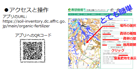 簡単な入力作業により、有機質資材の窒素肥効を予測し、見える化するアプリを開発した。 堆肥等の有機質資材は、有機・減肥栽培や土壌への炭素蓄積にとって不可欠であるが、肥効の見積もりが難しいことが欠点。このアプリは、農研機構と国立環境研究所が共同開発した新しい数理モデルと、地温などの環境データや資材の特性値を使って、資材の窒素肥効(減肥可能量)を予測する。 ![]() |