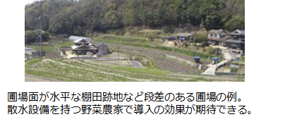価格帯・段が4段、総圃場面積18aで設置した事例での導入費用は約60万円。システム稼働に商用電力のコストは不要。使い捨てチューブを使用する場合は毎年交換経費が必要。適用地域全国(寒冷地では冬季には撤去・保管する) |