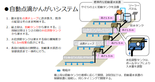 散水設備を使用している棚田跡地などの段差のある圃場では、区画ごとにバルブの開閉で順次灌水を行う必要があり、この労力の軽減が求められている。また、従来の散水管による灌水では畝間にぬかるみが生じる場合がある。 本技術は段差のある圃場の散水設備を活かし、タンクに一定量の水がたまると灌水が行われる拍動灌水装置を利用した自動点滴かんがいシステムである。 ![]() |