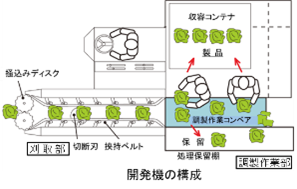 ・加工・業務用キャベツの収穫・選別・調製作業を1台の機械により行う高能率キャベツ収穫機。 ・1条の刈取部はキャベツ茎部をディスクで掴んで引抜き、ベルトで搬送・姿勢を補正して茎部を切断する。 ・調製作業部では、機上の作業者がコンベアを流れるキャベツの選別・調製を行い、収容コンテナに収める。 ・作業は、オペレータ1名、作業者2名~4名、ローダ等のオペレータ1名の4名~6名で行う。 ![]() |