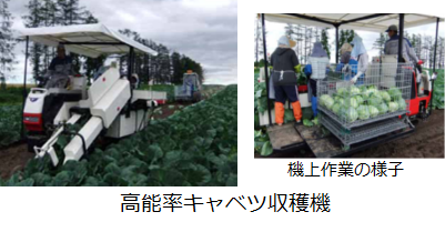 加工・業務用キャベツ収穫の機械化慣行のキャベツ生産労働時間(87hr/10a)の3割を占めていた収穫作業の機械化を達成。 収穫作業の高精度・高能率化外葉除去等の調製作業精度 90%以上、コンテナ収容を含む作業能率 2.9a/時、投下労働時間 17.4人・時/10a、慣行手作業の作業時間を40%以上削減。 |