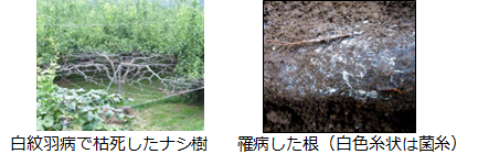 白紋羽病は、ナシやリンゴなど果樹類の根を腐敗させる難防除糸状菌病である。白紋羽病菌は温度耐性が低いため温水処理により菌糸を死滅させる防除技術を構築した。 果樹園の立木に地表面から温水を処理できるよう、温水処理機と点滴チューブを実用化した。樹体に悪影響を与えない温水処理条件を明らかにした。また、簡易な早期診断法により、処理すべき対象樹を適切に選ぶ方法も示している。 ![]() |