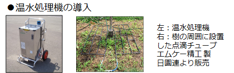 専用の処理機専用の温水点滴処理機(EB-1000 エムケー精工(株))が日本園芸農業協同組合連合会を通じて販売。 改良・普及の状況これまで長野県等25県余で実施実績あり 適応地域全国の果樹栽培地域 |