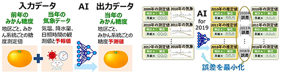 温州みかんを対象に、前年までに蓄積された糖度データと気象データから、AI(人工知能)による機械学習を用いて当年の糖度を予測する手法を開発した。本手法を用いることで、出荷時の平均糖度を7月ごろから地区を単位として高精度に予測できる。本手法により、適切な栽培管理が可能となり温州みかんの品質の向上に役立つ。 ![]() |