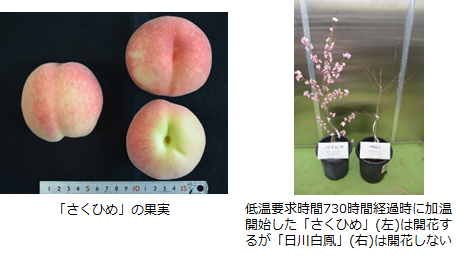 わが国のモモ品種は、花が咲くために冬季に7.2°C以下の低温に1,000時間~1,200時間さらされる必要がある。地球温暖化の進行により、今後、モモが開花できない栽培不適地が西日本で拡大すると予想されている。 低温要求量が少ないものの果実品質が劣るブラジルのモモ品種「Coral」とわが国のモモ品種との交雑を進めて、従来の主要品種の半分程度となる555時間の低温要求量でも栽培可能なモモ新品種「さくひめ」を育成した。 「さくひめ」は早生の主要品種の「日川白鳳」より数日早く収穫でき、果実の大きさや糖度は「日川白鳳」と同程度である。 |