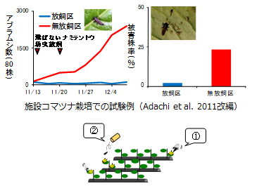 アザミウマ、コナジラミ、ハダニなどの重要害虫を天敵で防除している施設圃場では、アブラムシによる被害が顕在化しやすい。また、輸出時の残留農薬対策、有機農業、化学農薬の散布作業の軽減などの観点からも、天敵によるアブラムシ防除技術が求められている。 飛ばないナミテントウは、通常のナミテントウでは、作物上に放してもすぐに飛んで逃げられる問題を解決するために育成された、遺伝的に飛翔能力を欠く系統である。施設野菜の天敵製剤として農薬登録され、(株)アグリセクトから販売されている。 |