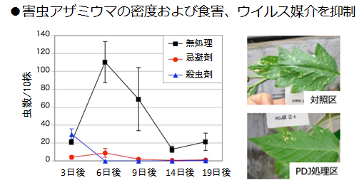 プロヒドロジャスモン(PDJ)は、これまで植物成長調整剤として使用されてきたが、令和3年3月にトマト・ミニトマトのアザミウマ類に対する害虫忌避剤として登録認可を取得した。本剤は、植物の害虫抵抗性を誘導することにより、害虫を作物から忌避させる作用を持つ。害虫の薬剤感受性の低下が生じにくく、農産物の安定した生産・供給に大きく貢献する。 害虫アザミウマの密度および食害、さらには植物ウイルスの媒介を抑制することにより、被害を軽減可能である。さらに多くの作物や害虫類に適用できることが見込まれており、普及の拡大が期待される。 ![]() |