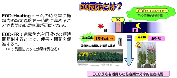 重油消費量(暖房コスト)を30%削減温度や光に対する感受性の高い日没後の時間帯(End of Day : EOD)に、 ・ハウス内の設定温度を一時的に高めると(EOD-Heating処理)、夜間を低温管理としても生育・開花が確保され栽培期間中の燃料使用量を削減可能。 ・遠赤色光(FR光:波長730 nm前後)を照射(EOD-FR照射)すると、草丈伸長や開花の促進により栽培期間が短縮され、切り花の早期出荷が可能。 |