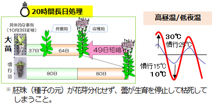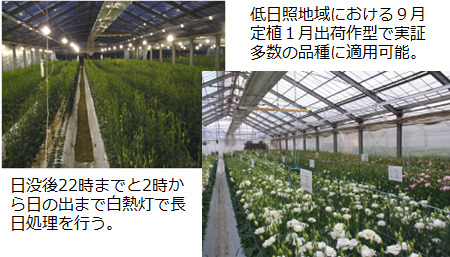 慣行よりも生育を進めた大苗を定植し、生育初期に重点施肥し、長日処理を行って花芽分化と蕾の発達を促進し、慣行よりも高い30°C目標の昼温と低い10°C設定の暖房によって、生育を促進してブラスチング※を抑制し、冬春季(1-3月)に計画生産を可能にする栽培体系。 ![]() |