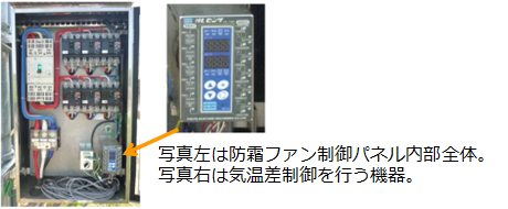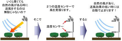 防霜ファンは茶生産に甚大な経済被害をもたらす凍霜害の対策として広く普及している。強い自然風があると防霜ファンの送風による空気攪拌効果が小さく、送風の必要性が低い。本制御技術は、樹冠面付近と防霜ファン設置高との気温差から風の強さを推定し、送風効果が小さい時には稼働を抑制する。(1)樹冠面付近の気温が低い(2)2つの温度センサの気温差が大きい時に防霜ファンが稼働(従来の制御は(1)のみで稼働)する。ただし気温が大きく下がった際には温度差に関わらず稼働することも可能。 ![]() |