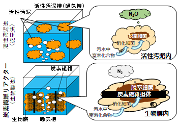 汚水浄化処理施設の曝気槽に炭素繊維リアクターを導入することで、担体表面に厚い生物膜が形成されて酸素の嫌いな脱窒菌の生息スペースが大きくなるため、脱窒がスムーズに進行し、一酸化二窒素 (N2O)の排出が削減される。 ![]() |