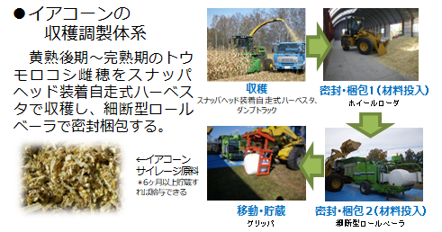 家畜の飼料には粗飼料と濃厚飼料があり、濃厚飼料は約90%が輸入である。現在の牛乳生産において、乳量・乳質の確保には濃厚飼料の給与が必須である。 一般的に飼料用トウモロコシは茎葉を含むホールクロップサイレージとして利用されるが、雌穂のみを収穫しサイレージ化したイアコーンサイレージは栄養価が高く、自給濃厚飼料として生乳生産に利用できる。 ![]() |