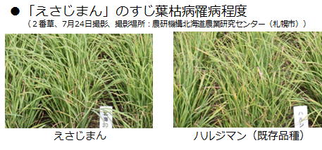 「えさじまん」は、農研機構と雪印種苗株式会社が共同育成した栄養収量の多い中生品種である。糖含量が既存品種より約3ポイント高いためサイレージ発酵品質は良好となり、繊維成分が少なく、栄養価が高いことから乳牛の摂取養分量の増加により産乳量の増加が期待できる。 利用は採草を主体とする。夏季の2及び3番草が既存品種より5-6%多収で、すじ葉枯病に対する耐病性に優れ、夏季の環境耐性は優れる。アルファルファなどマメ科牧草との混播では良好なマメ科率を維持できる。 以上より、既存品種と比較して、飼料の生産性の向上が図られる。 |