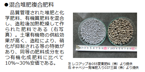 化学肥料等を混合することで窒素肥効を確保堆肥の窒素肥効は一般的に低いが、化学肥料や有機質肥料を混合し窒素肥効を確保。 有機物の供給効果が高い堆肥由来有機物は土壌中では分解しにくいため、有機物供給効果が既売の有機入り化成肥料等に比べて高い。 施肥コスト削減岡山県の年内どりキャベツ作では、混合堆肥複合肥料により、追肥を省け、かつ収量を保ったまま施肥コストを約6,700円/10a(約15%)に低減可能。 ![]() |