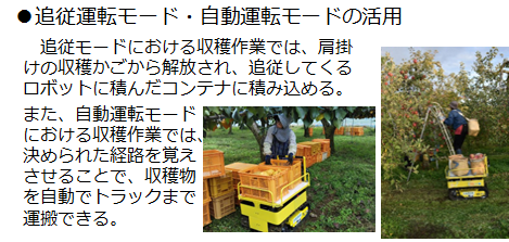 電動化による温室効果ガス排出削減電動化により温室効果ガスの排出削減が期待される。 農業現場における労働力の不足をロボットで代替作業者とロボットの協働作業により、農作業を軽労化する。また、ロボットによる自律作業を行うことで省力化が期待できる。 ![]() |