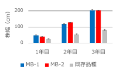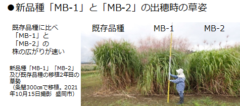 省力的にバイオマス植物の栽培が可能一般的にオギススキは、草地造成を行えば数十年の利用が可能であり、さらに、年1回の施肥と収穫作業で圃場の管理が可能なため、省力的な栽培が可能である。 移植苗数を通常の1/4に削減可能「MB-1」と「MB-2」は株の横への広がりが速いため、既存品種ではヘクタール当たり10,000苗を移植するが、新品種では2,500苗で草地造成可能である。 ![]() |