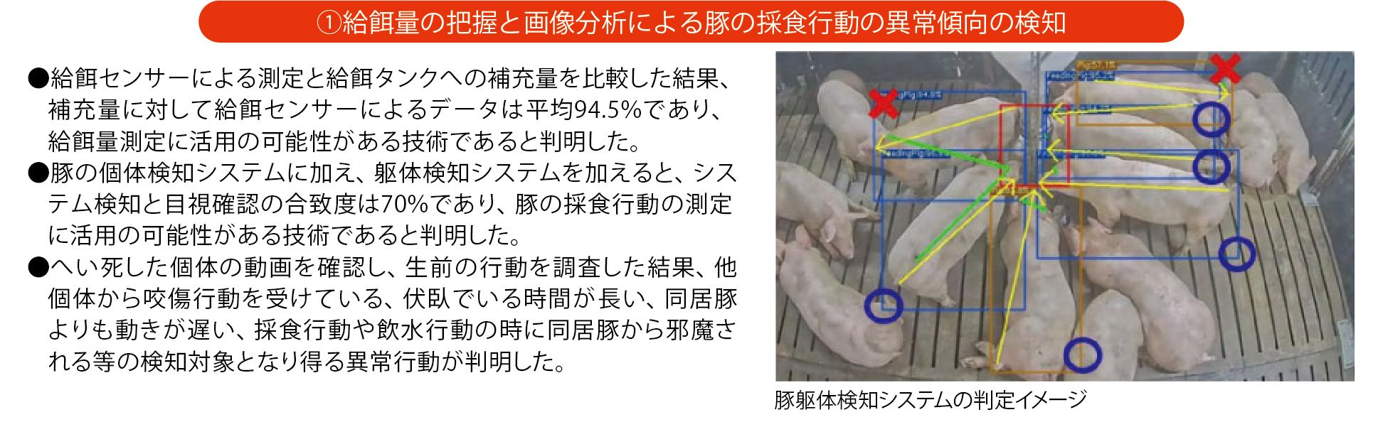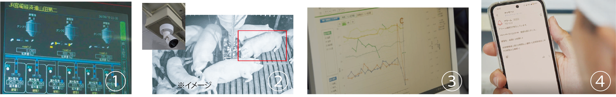 ①給餌量・給水量リアルタイム把握 ②豚舎カメラ ③経営データ分析ツール ④異変検知アラートシステム