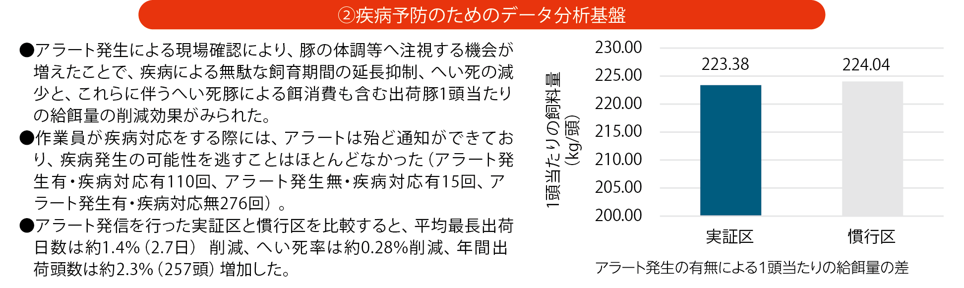 - 疾病の可能性を通知するアラート発生時に疾病対応を実際に行った割合は3割程度であったことから、環境アラートについては季節性 をより正確に反映させるため多年にわたるデータの蓄積と分析を行うこと、給餌量に係るアラートはより多くの日齢毎の給餌量データ を取得し、アラート発生基準値の適切な調整を行うことで、アラートシステムの設定内容の改善を図る。