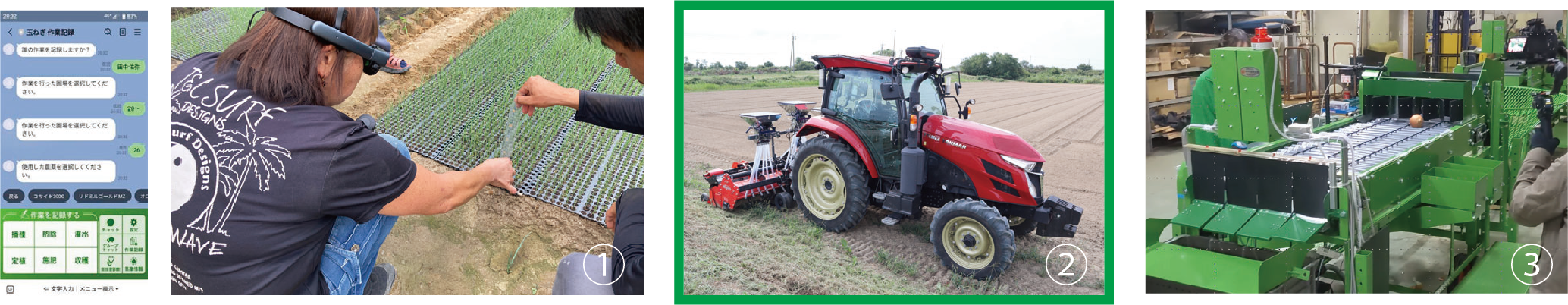 ①遠隔技術指導システム ②ロボットトラクタ ③AI自動選果機