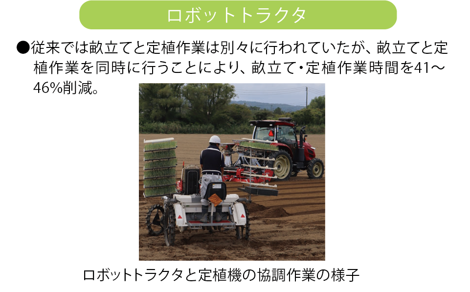 - ロボットトラクタの導入により、畝立て・定植作業に要する時間が41~46%削減となり目標達成。