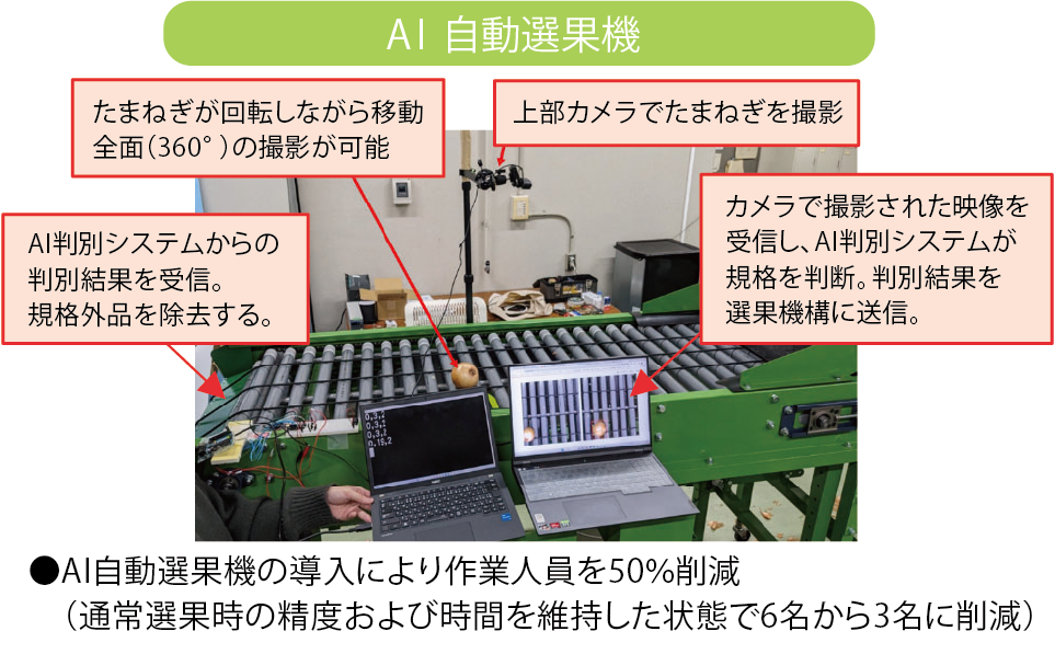 - AI自動選果機の導入により、選果作業に要する人員が50%削減となり目標達成。