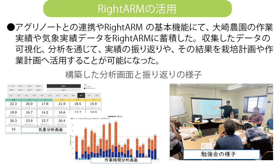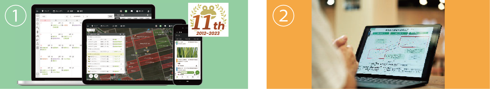 ①営農支援ツール「 アグリノート」 ②経営管理クラウド「 RightARM」