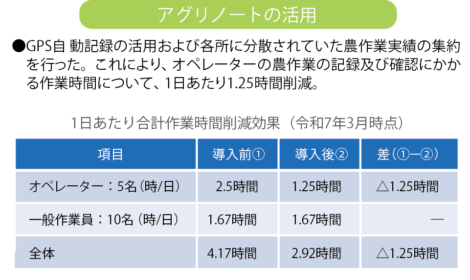- 削減した作業時間の余力は、計画していた堆肥施用・緑肥栽培を可能な限り行ったことを確認した上で、草取りに投入。その結果、害虫発生抑止につながり化学農薬の使用量を25.5%削減。一方で、化学肥料使用量は、0.5%削減。