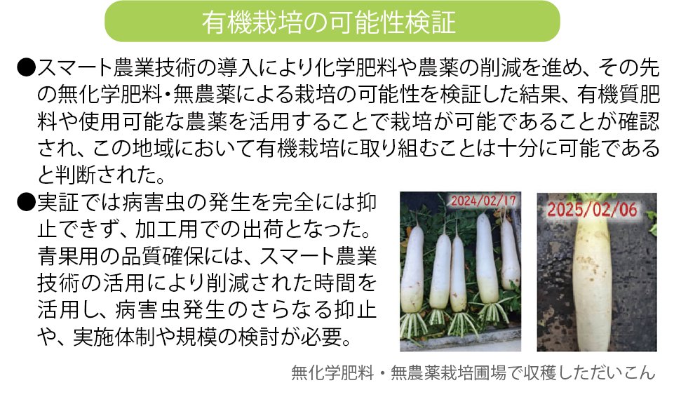 だいこんの大規模生産における生産工程管理のデジタル化による生産性向上と、余力を活用した有機栽培を目指した化学肥料・農薬使用量削減の実証