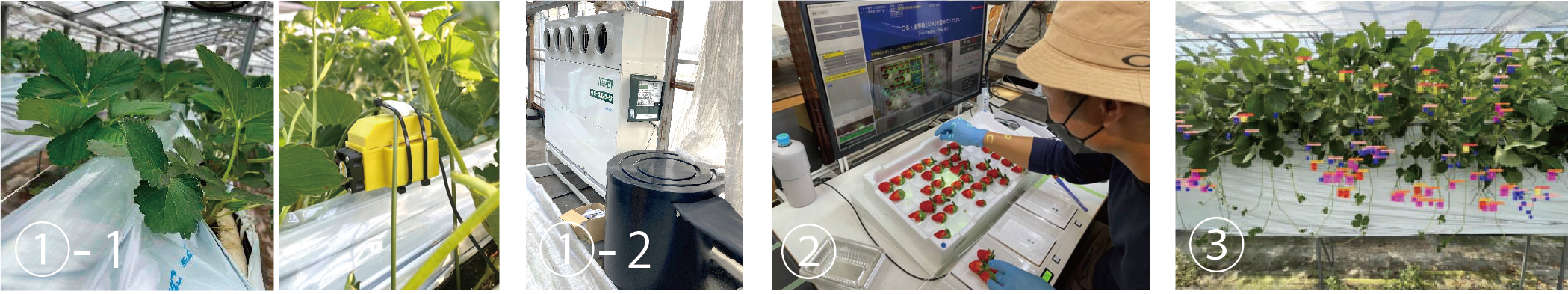 ①-1 局所環境制御 ①-2 高効率ヒートポンプ ②スマート選果システム ③出荷量予測