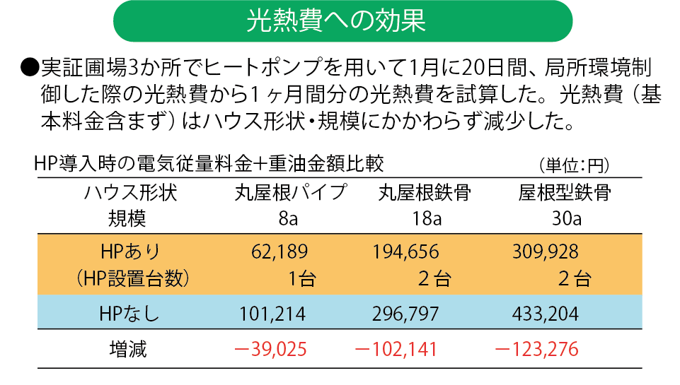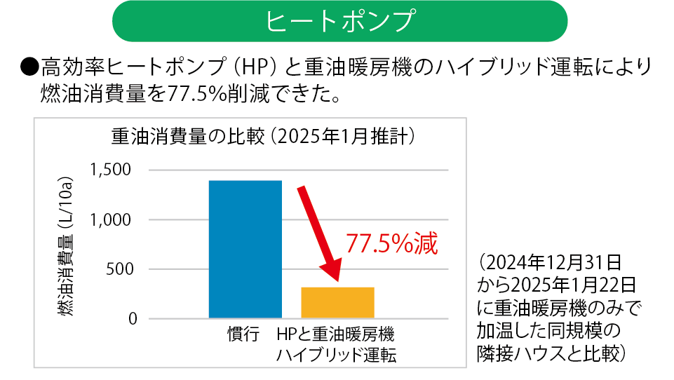 - 高効率ヒートポンプと重油暖房機を併用したハウスにおいて、燃油消費量が77.5%削減。