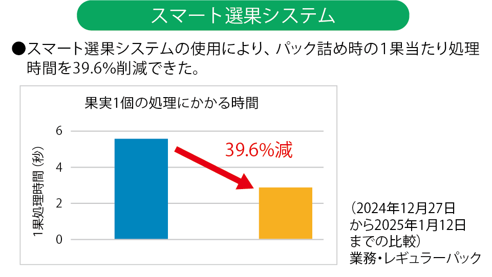 - スマート選果システムを用いることで、いちご1果当たりのパック詰め平均処理時間が、39.6%削減。