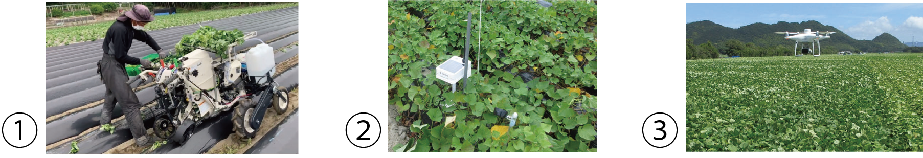 ①さつまいも移植機 ②圃場環境観測装置 ③ドローンによる生育・病害虫センシング ④貯蔵環境観測・制御 ⑤営農管理システム