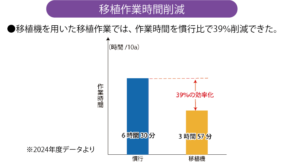 - 移植機を利用することにより、慣行の手作業と比べて、移植作業時間を39%削減でき、目標を達成。