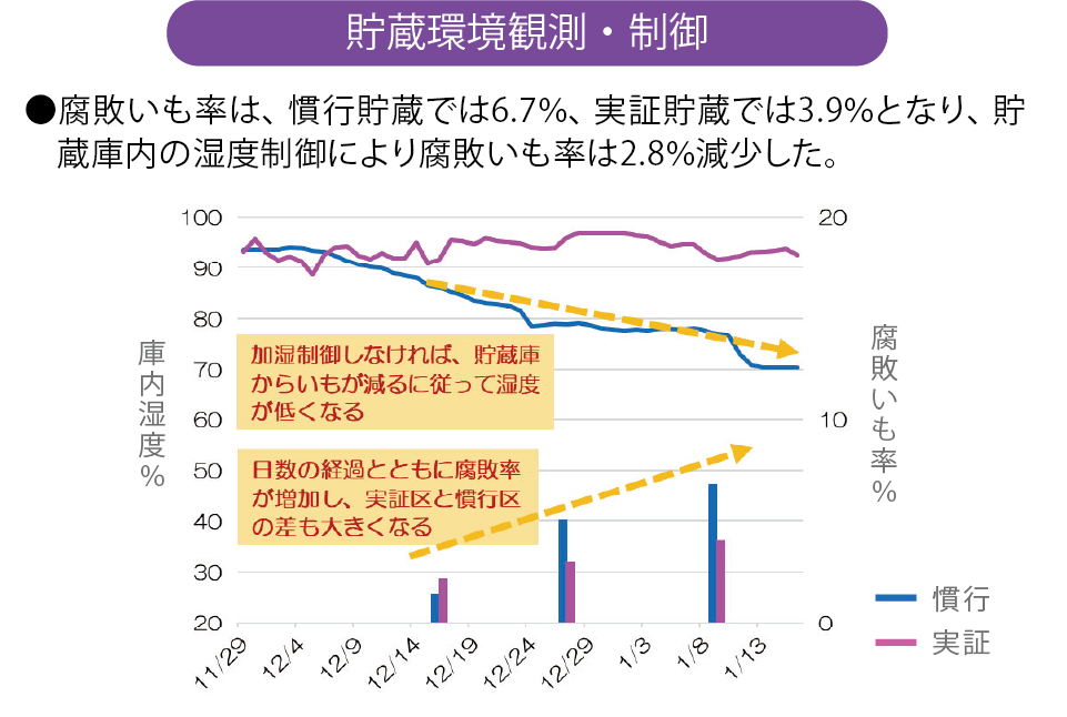 - 貯蔵腐敗の低減については、貯蔵環境把握の重要性や加湿制御も安価に取り組めることを講習会等を通じ説明する。