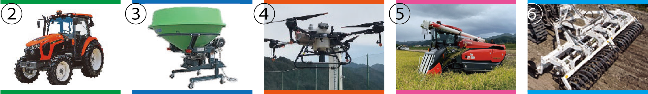 ①営農支援システム ②ロボットトラクタ ③GPS搭載車速連動ブロードキャスタ ④施肥・防除用ドローン ⑤食味・収量コンバイン ⑥レーザーレベラ ⑦シーダー ⑧播種同時除草剤散布 ⑨センシングドローン