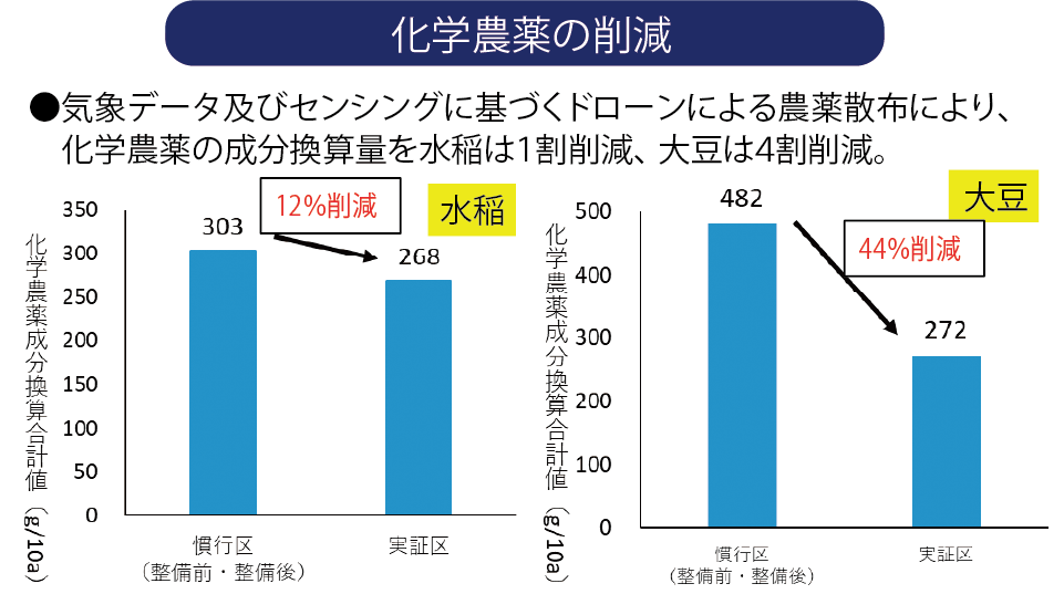 - 気象データ及びセンシングに基づくドローンによる農薬散布により、化学農薬の成分合計量を水稲では1割削減、大豆では4 割削減し、目標を達成。