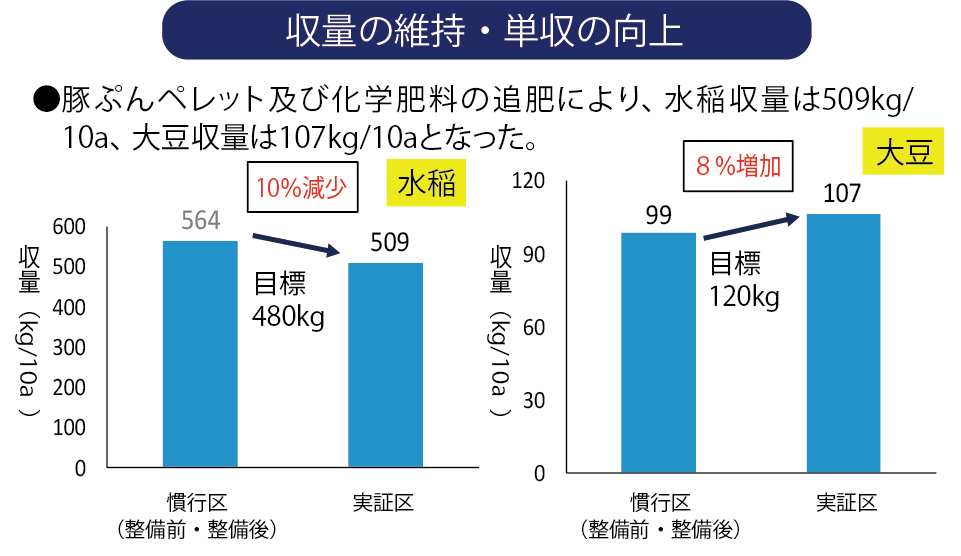 - 豚ぷん堆肥を基肥とし、化学肥料の追肥により、収量は水稲509kg/10a( 目標480kg/10a) で目標を達成。大豆では長雨による播種遅れ等に より107kg/10a ( 目標120kg/10a) となった。