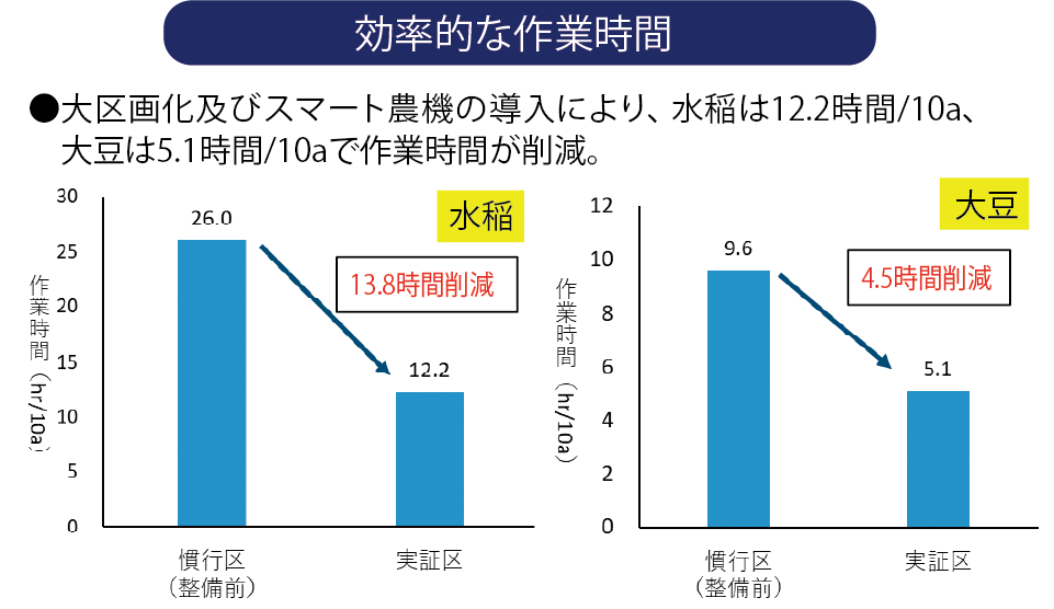 - 大区画化及びスマート農機により、作業時間を水稲12.2 時間/10a、大豆5.1 時間/10a で目標を達成。