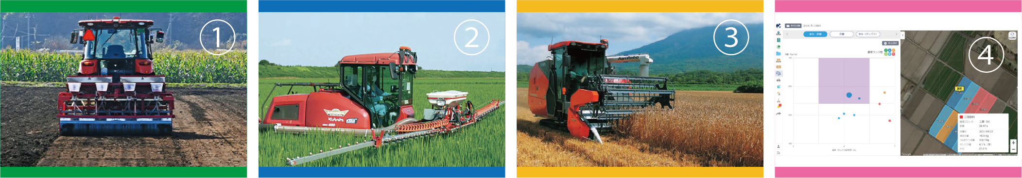 ①無人トラクタ ②衛星センシング+可変施肥ハイクリブーム ③収量コンバイン+可変施肥対応ブロードキャスタ ④営農管理システム