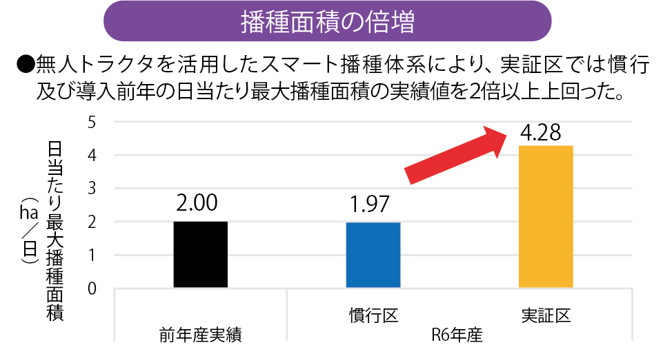 - 無人トラクタを活用したスマート播種体系を構築し、日当たり最大播種面積が倍増以上となって目標を達成。播種能力が向上したことで適期播種が実現するとともに、排水対策を行う時間を確保でき単収が約40%向上。