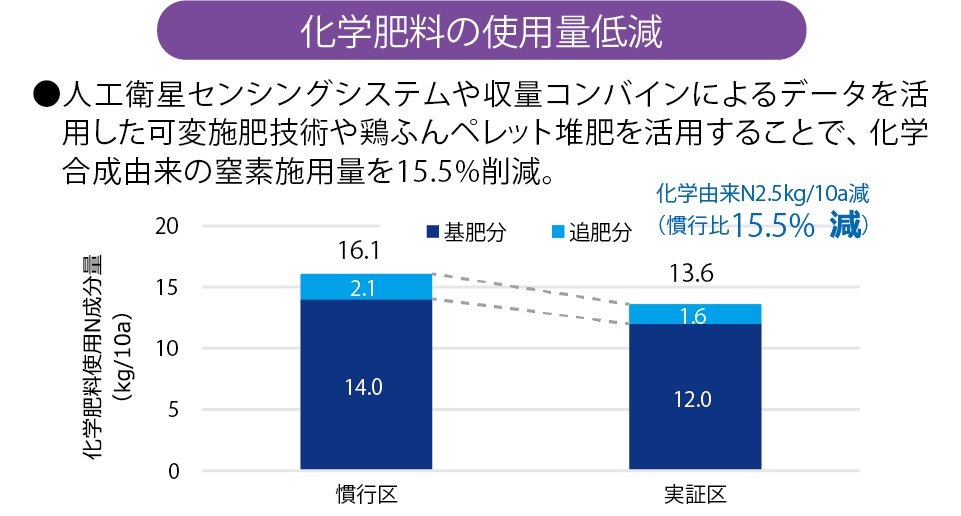 - 人工衛星センシングシステムや収量コンバインによるデータを活用した可変施肥技術や鶏ふんペレット堆肥を活用することで、化学肥料由来の窒素施用量を15.5%削減し、目標達成。